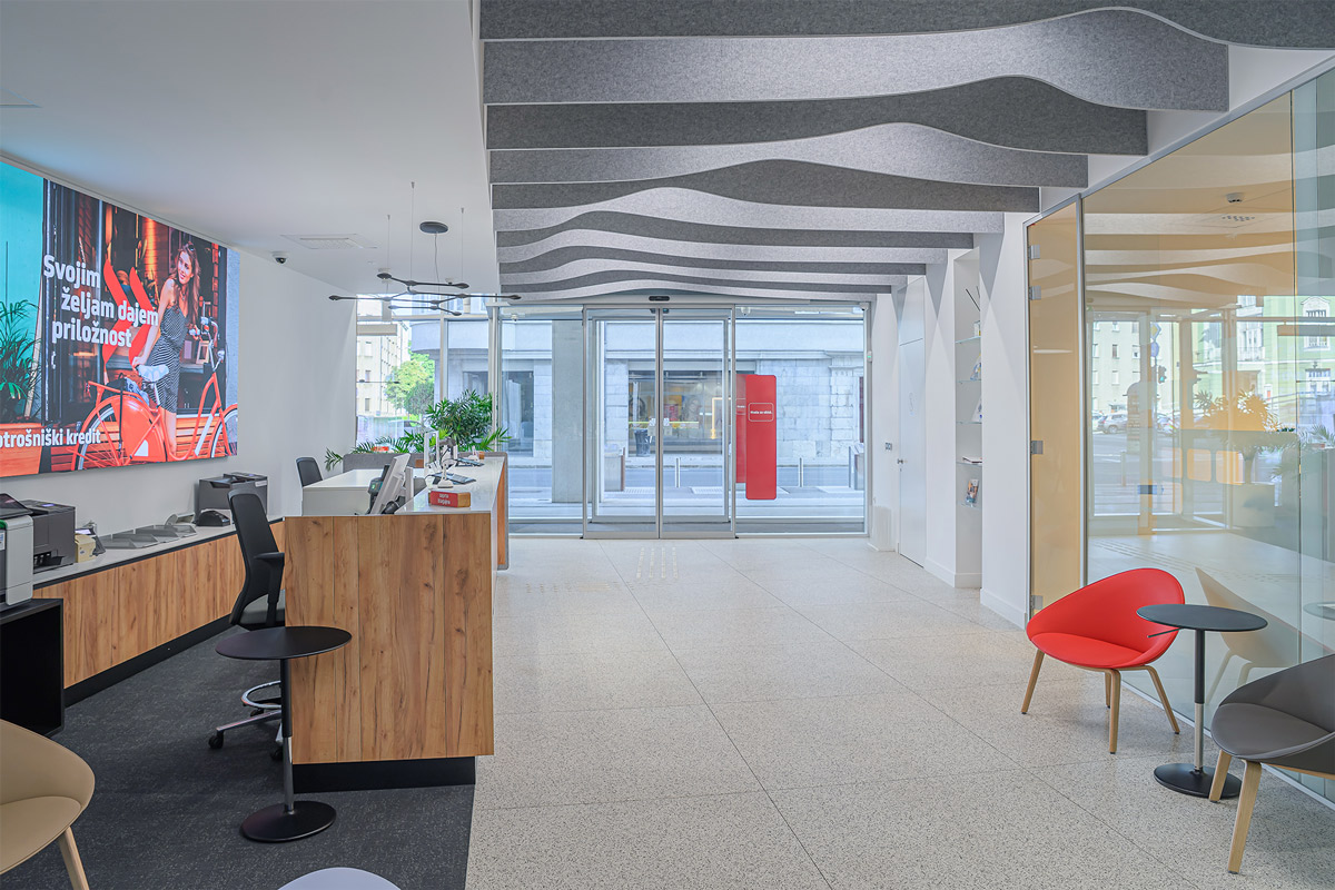 Interier je sestavljen iz dveh delov: sprednji odprti del za vsakodnevne bančne storitve ter zaledne pisarne, namenjene zaposlenim.