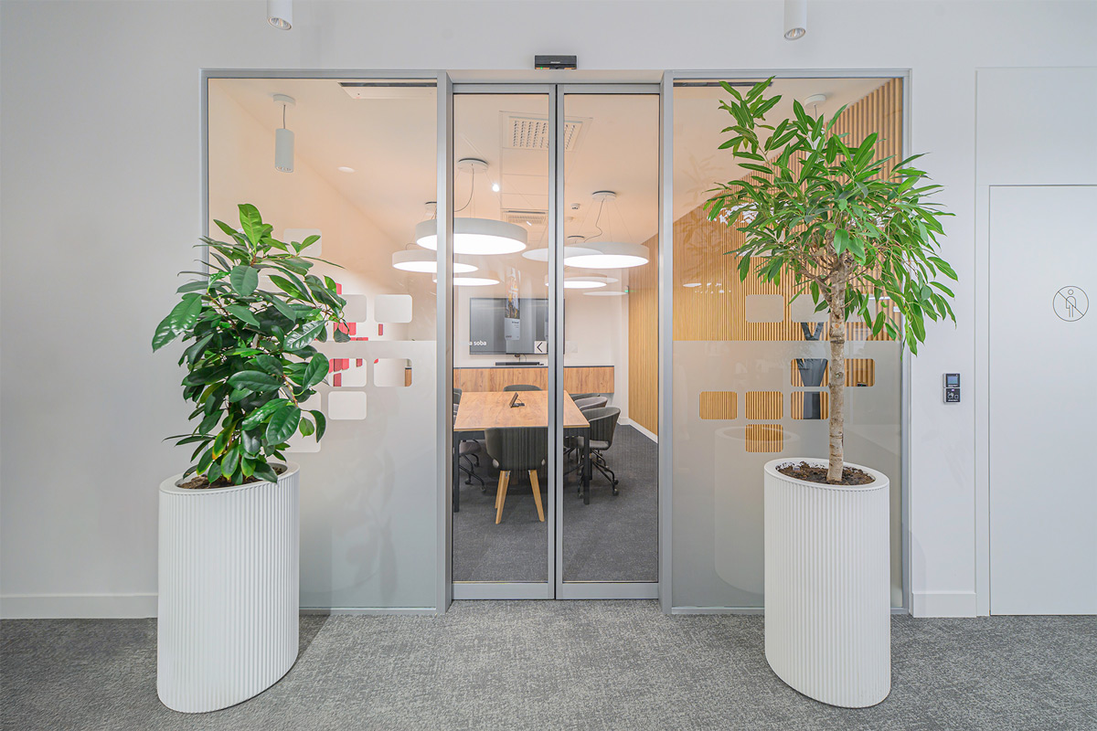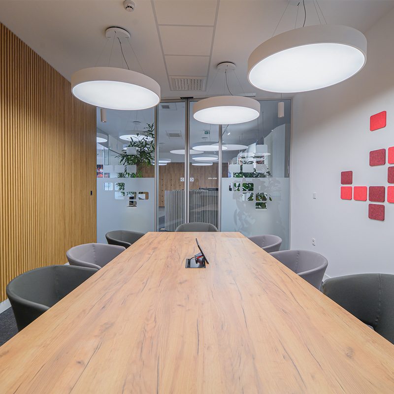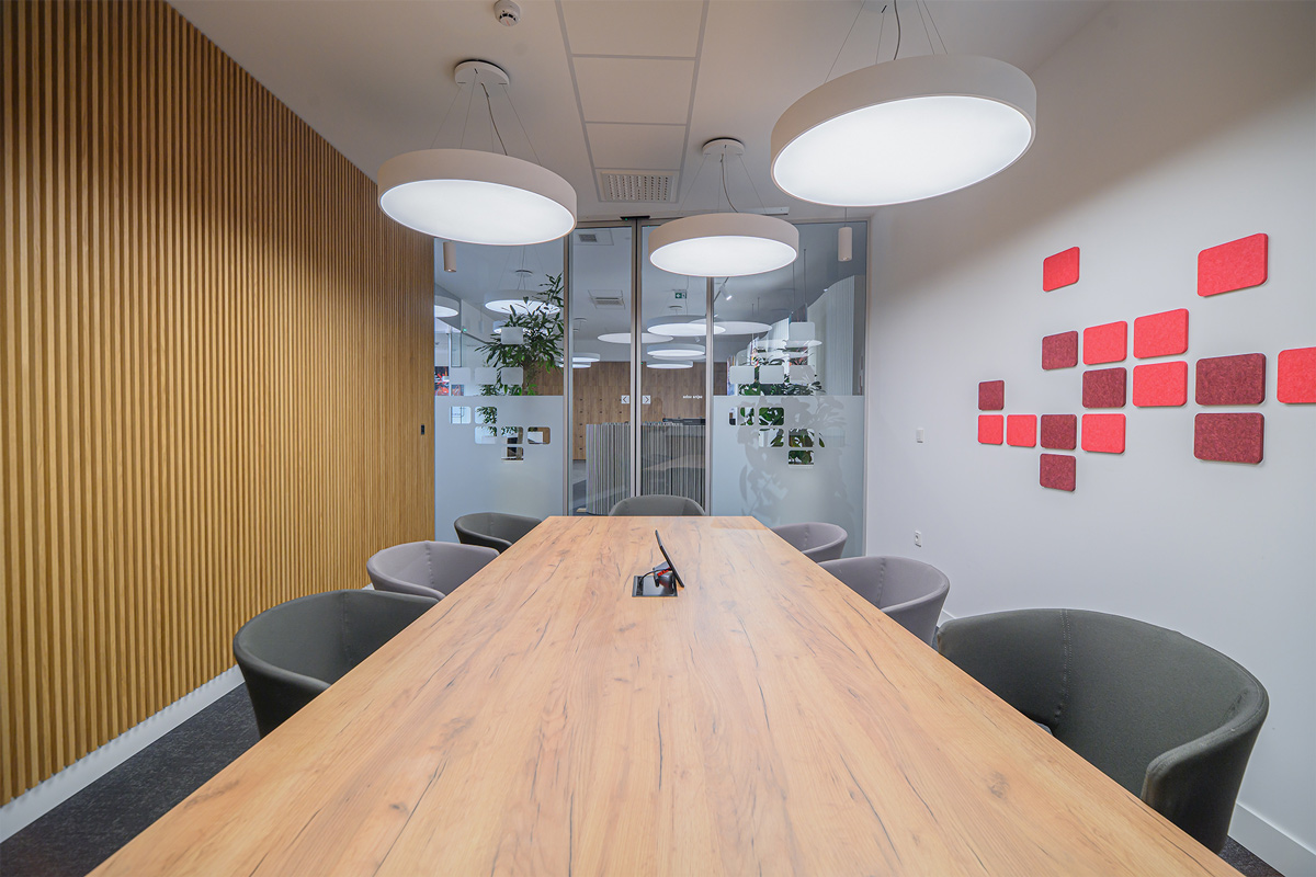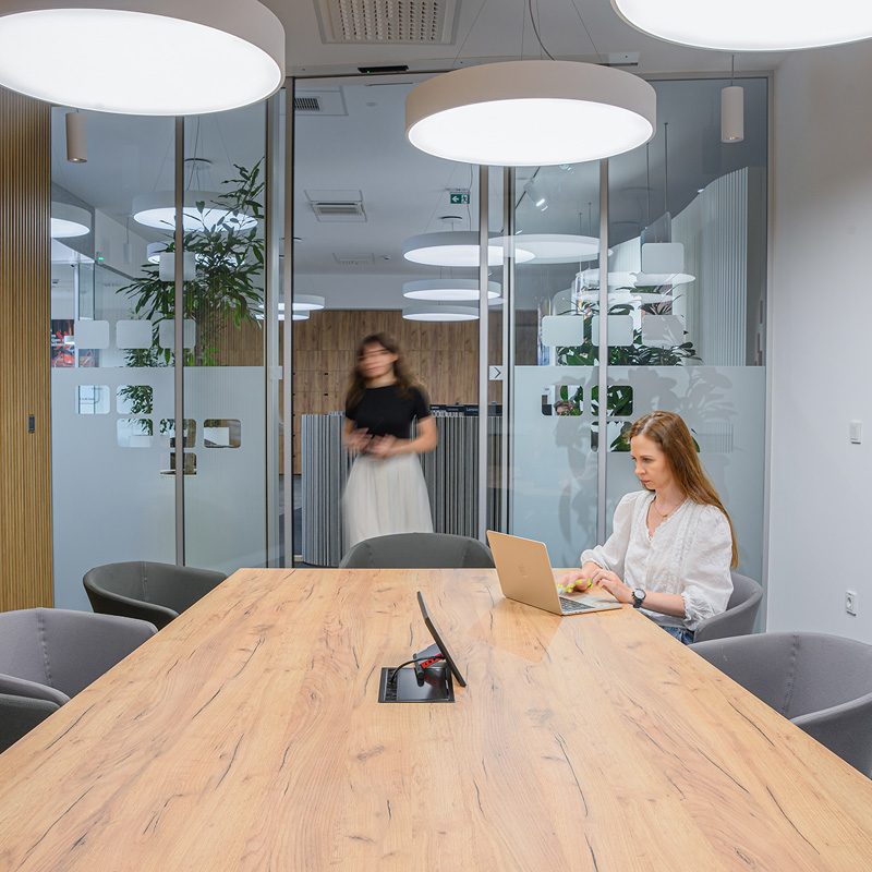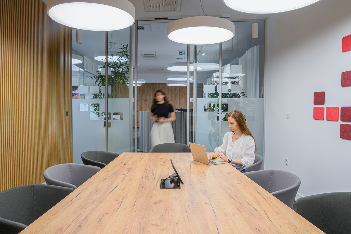 Trajnostni materiali, kot so teraco, hrastov les in kovina, se dopolnjujejo z recikliranimi akustičnimi paneli in pametno razsvetljavo, ki se prilagaja naravni svetlobi. Rezultat je topel, sodoben in okolju prijazen interier.