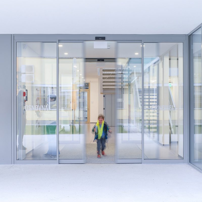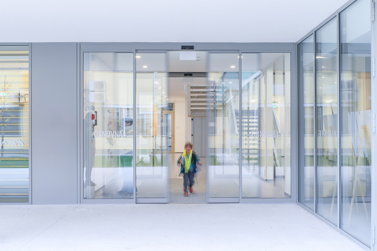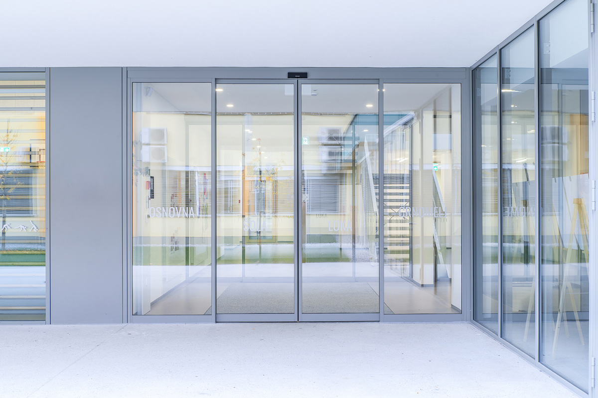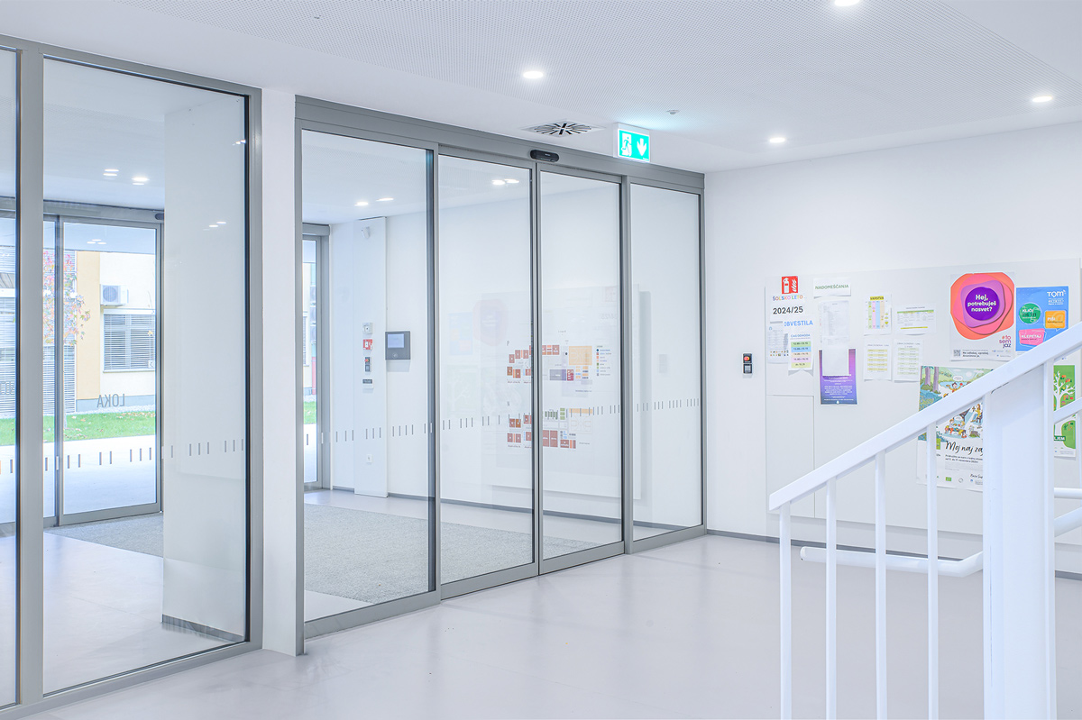 Steklena fasada skupaj z avtomatskimi drsnimi vrati 300 na glavnem vhodu odpira pogled proti sosednjemu parku in prepušča obilico naravne svetlobe v notranjost. To izboljšuje dobro počutje in koncentracijo otrok, prispeva k boljšim učnim izkušnjam ter ustvarja prijetno in spodbudno okolje za učence in učitelje.