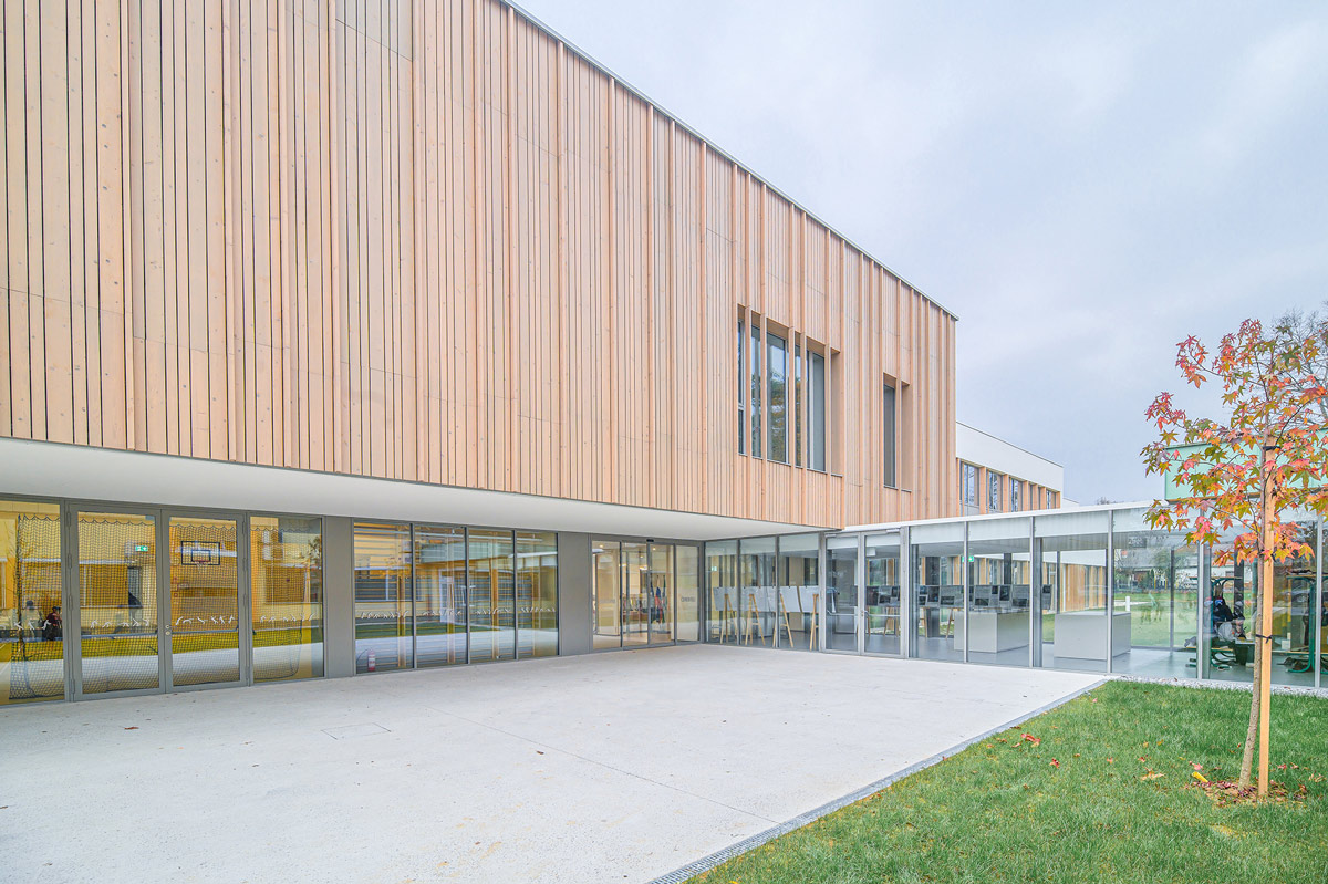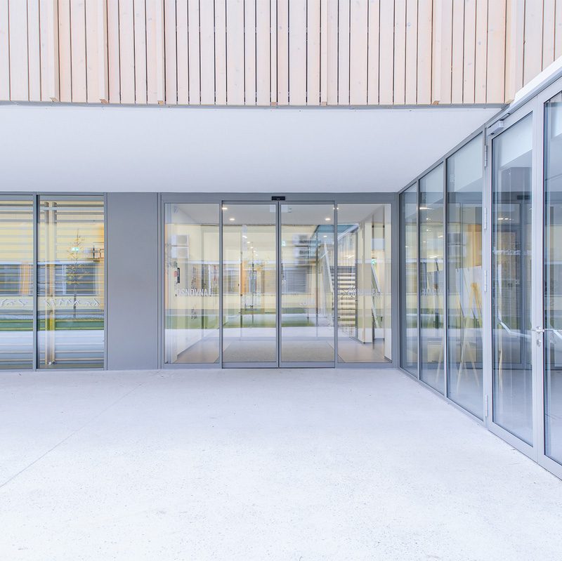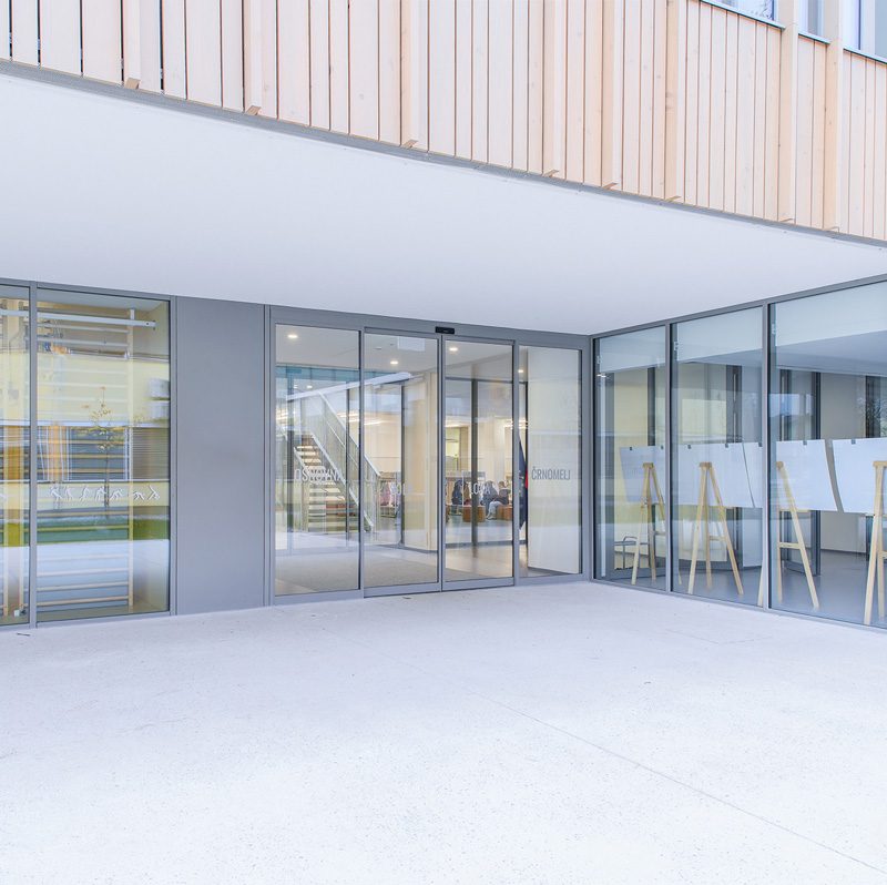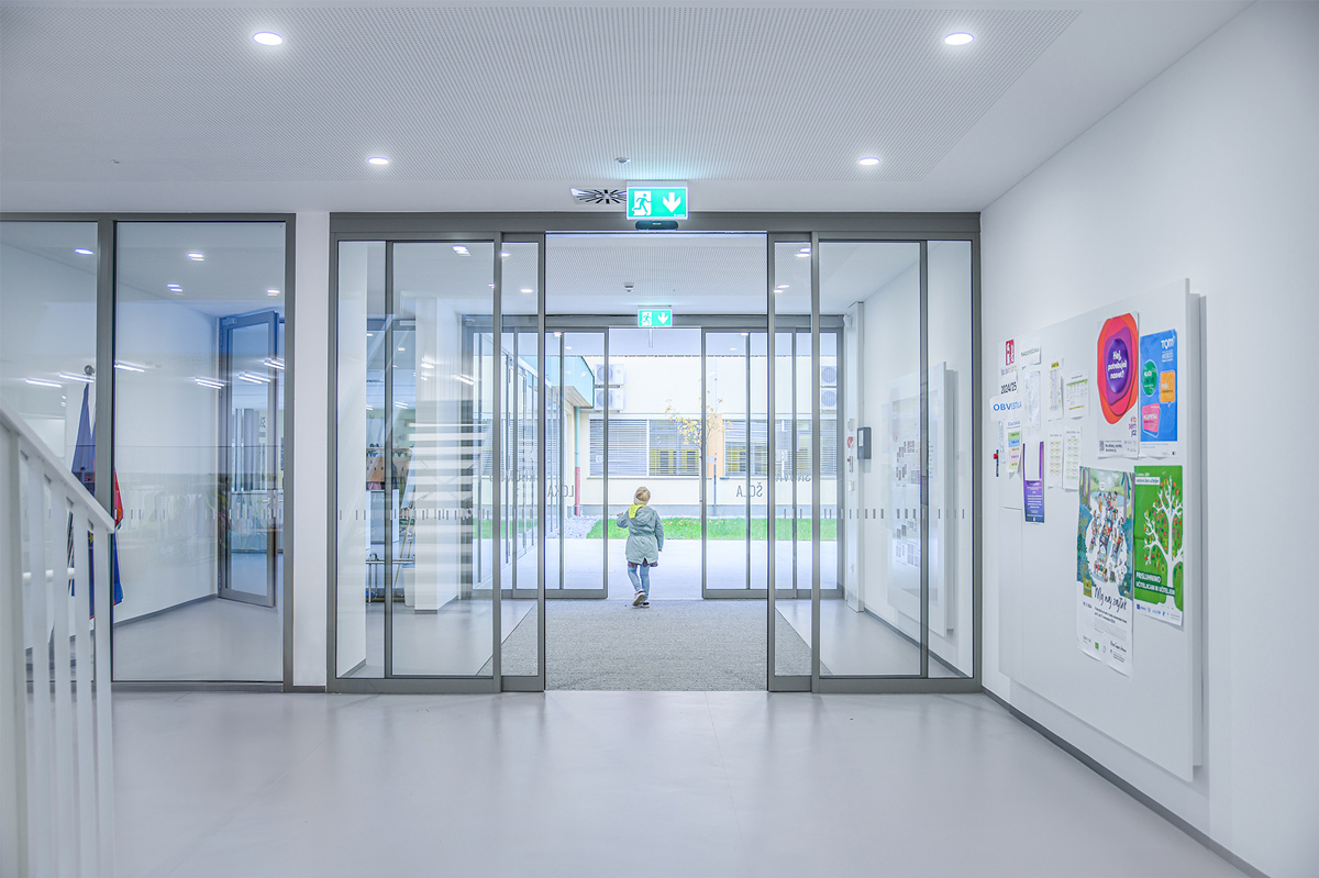 Steklena fasada skupaj z avtomatskimi drsnimi vrati 300 na glavnem vhodu odpira pogled proti sosednjemu parku in prepušča obilico naravne svetlobe v notranjost. To izboljšuje dobro počutje in koncentracijo otrok, prispeva k boljšim učnim izkušnjam ter ustvarja prijetno in spodbudno okolje za učence in učitelje.