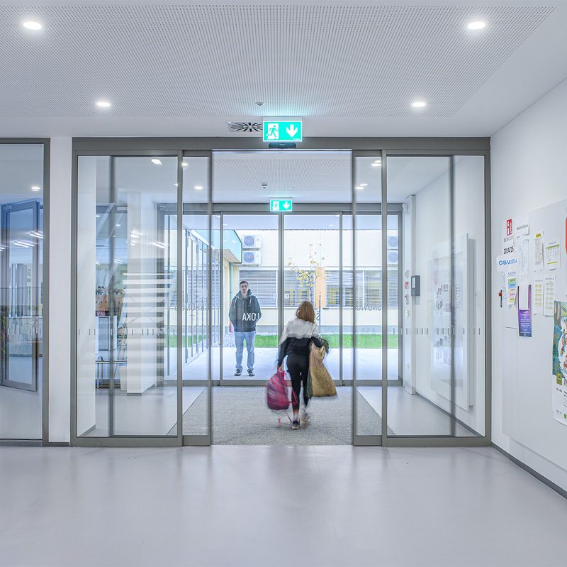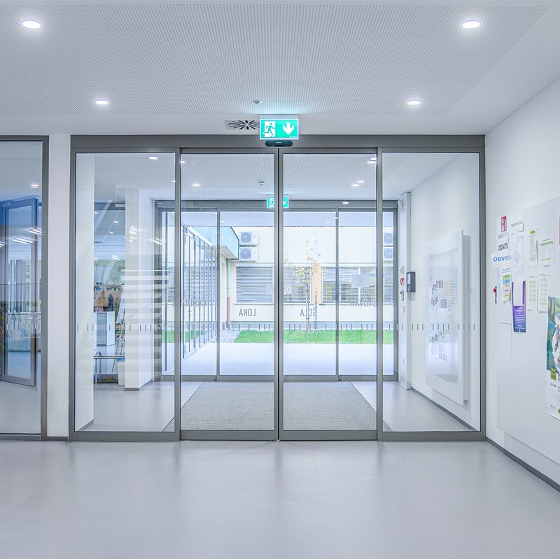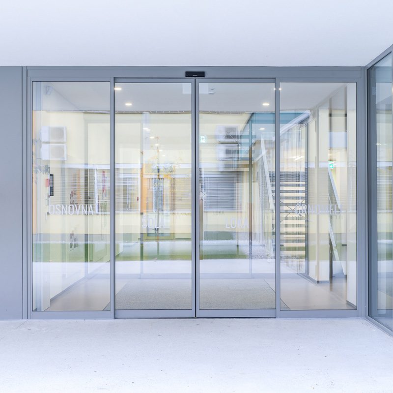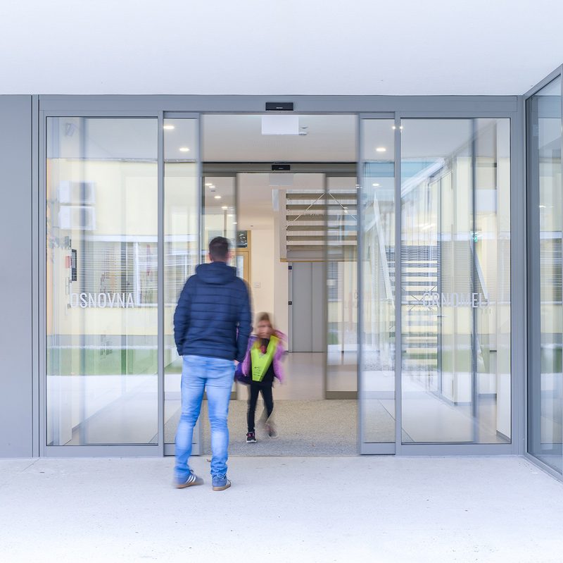 Glavni vhod šole je opremljen z dvojnimi standardnimi avtomatskimi drsnimi vrati 300, ki zagotavljajo varen, hiter in brezstičen prehod za vse uporabnike.