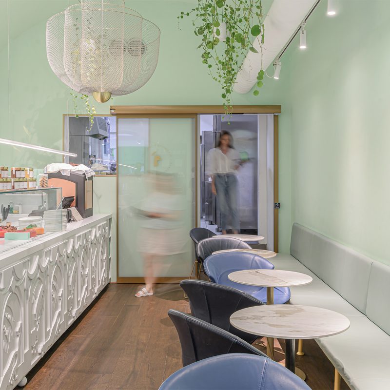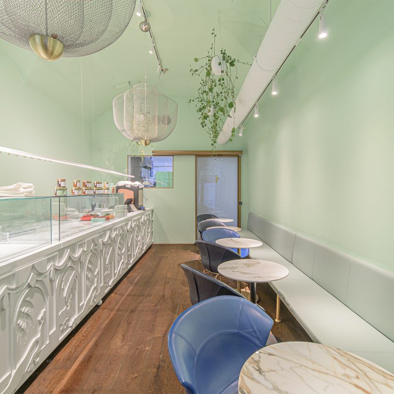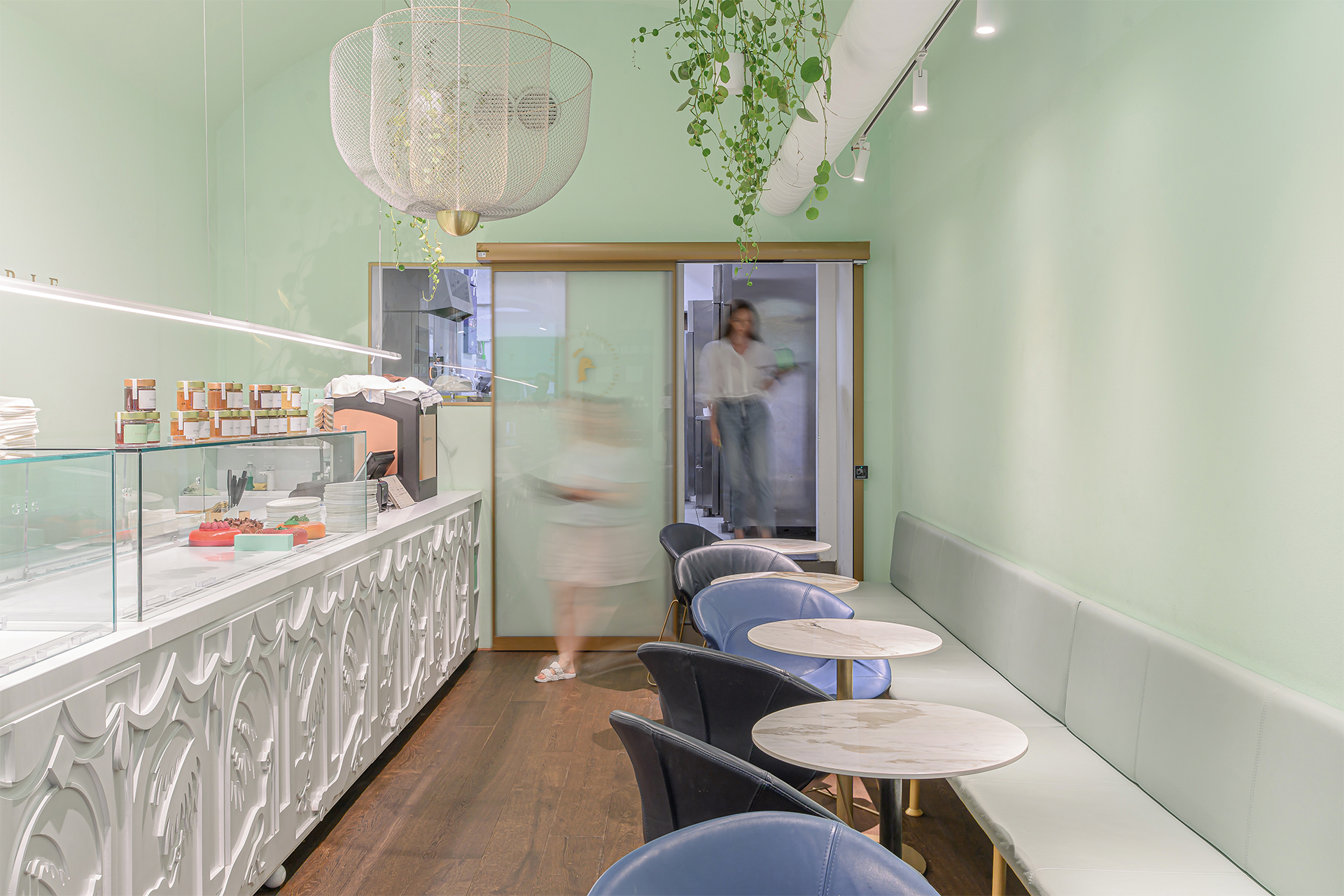 Notranjost slaščičarne združuje prijeten prostor z mizami za goste in pult s slaščicami. Mehki zeleni toni interierja delujejo toplo in elegantno, vendar ozek prehod med kuhinjo in glavnim prostorom zahteva pametno rešitev odpiranja.