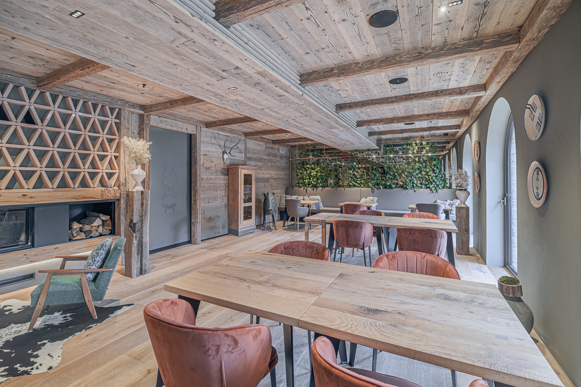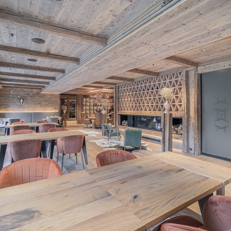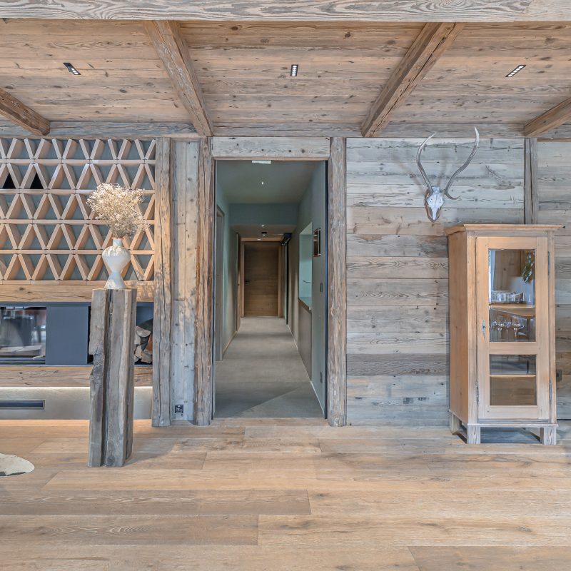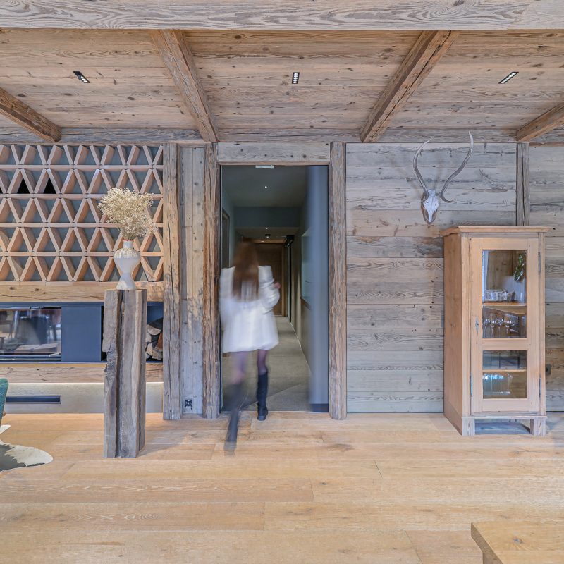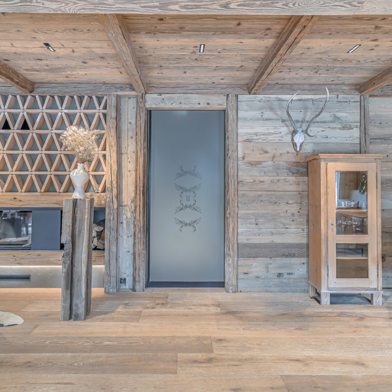 Interier Vile Muhr je topel in domačen, z izrazitim poudarkom na naravnih materialih in občutku ekskluzivnosti.