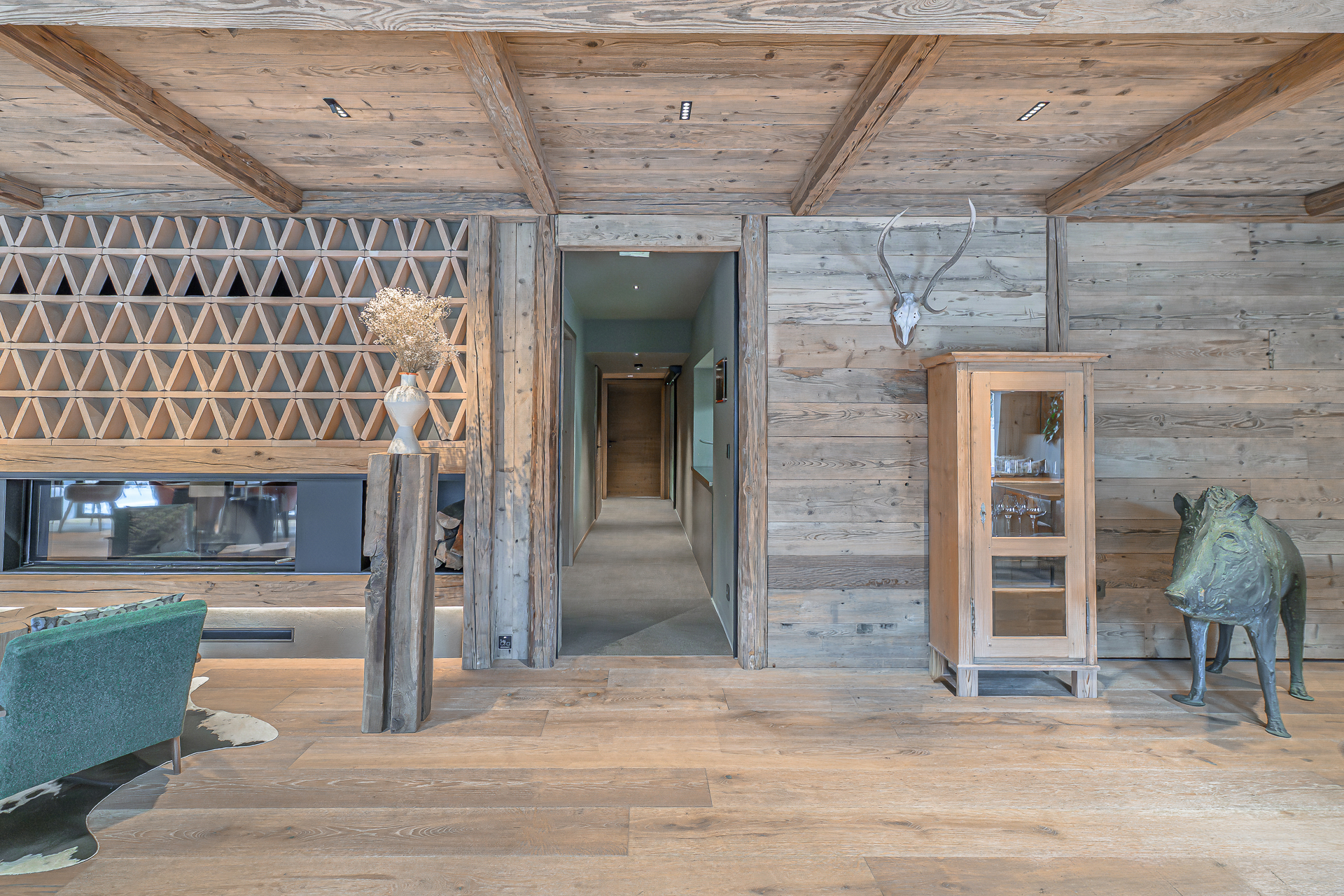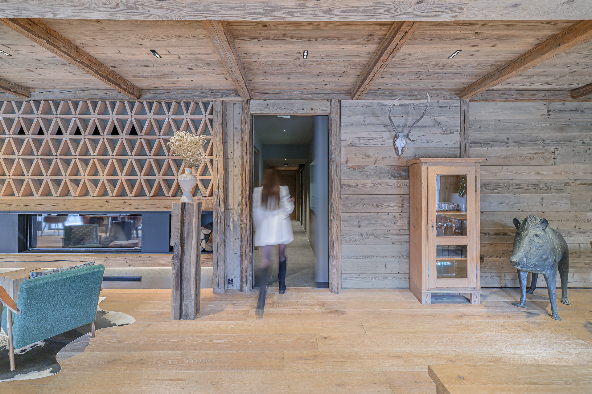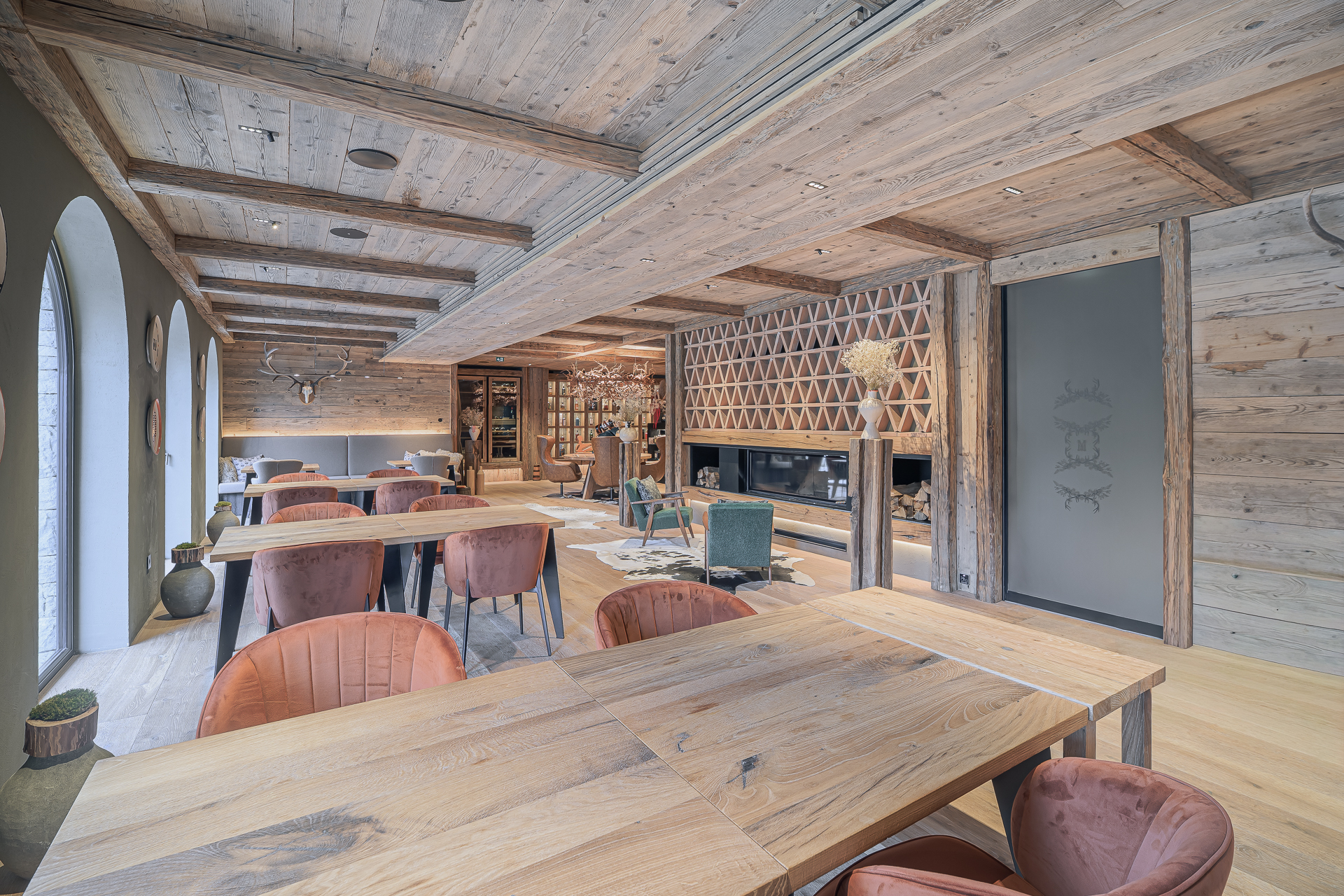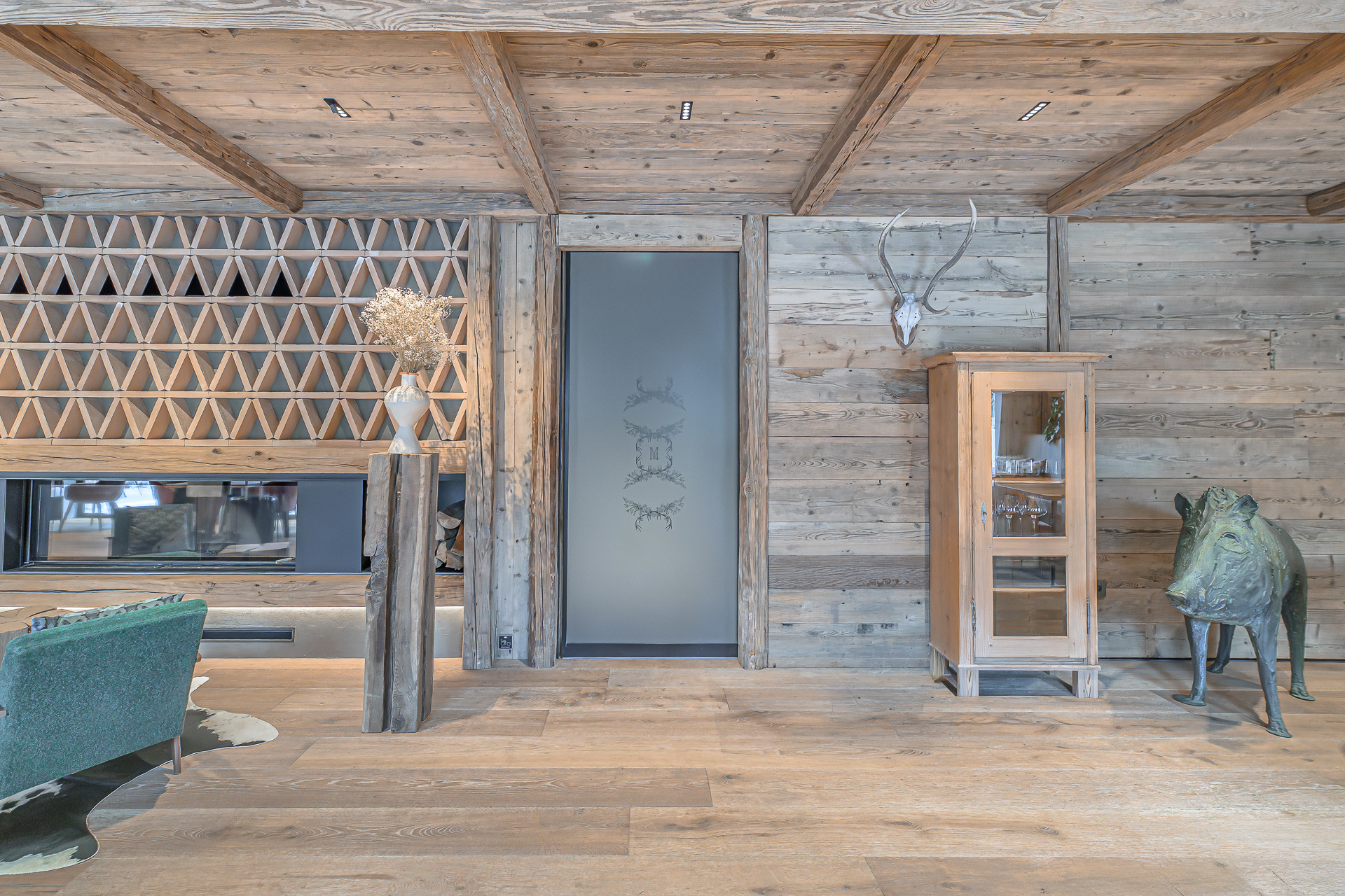 Interier Vile Muhr je topel in domačen, z izrazitim poudarkom na naravnih materialih in občutku ekskluzivnosti.