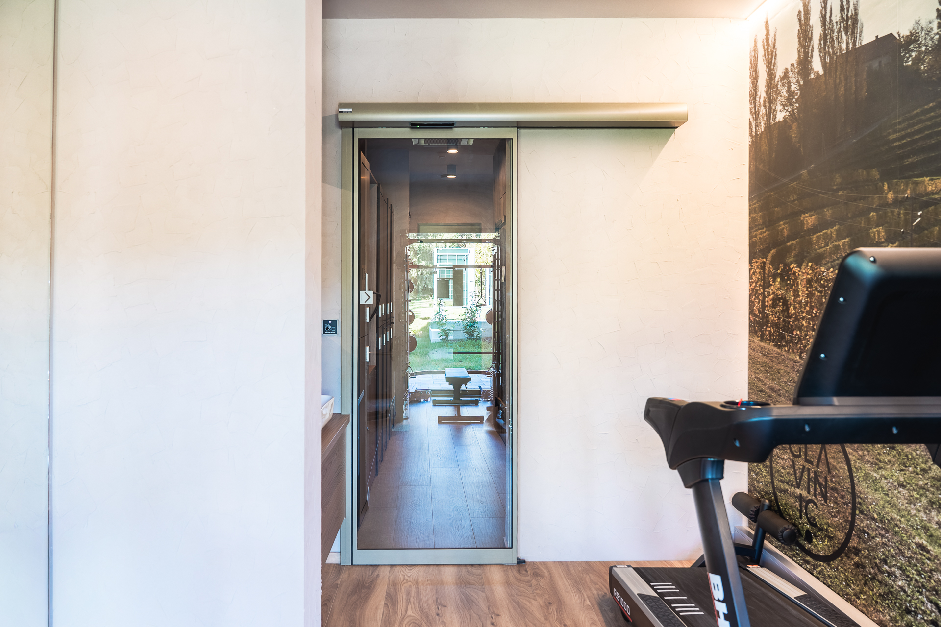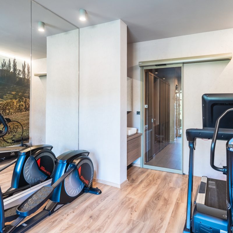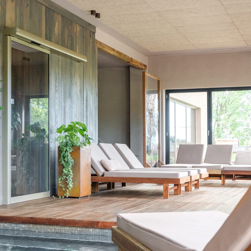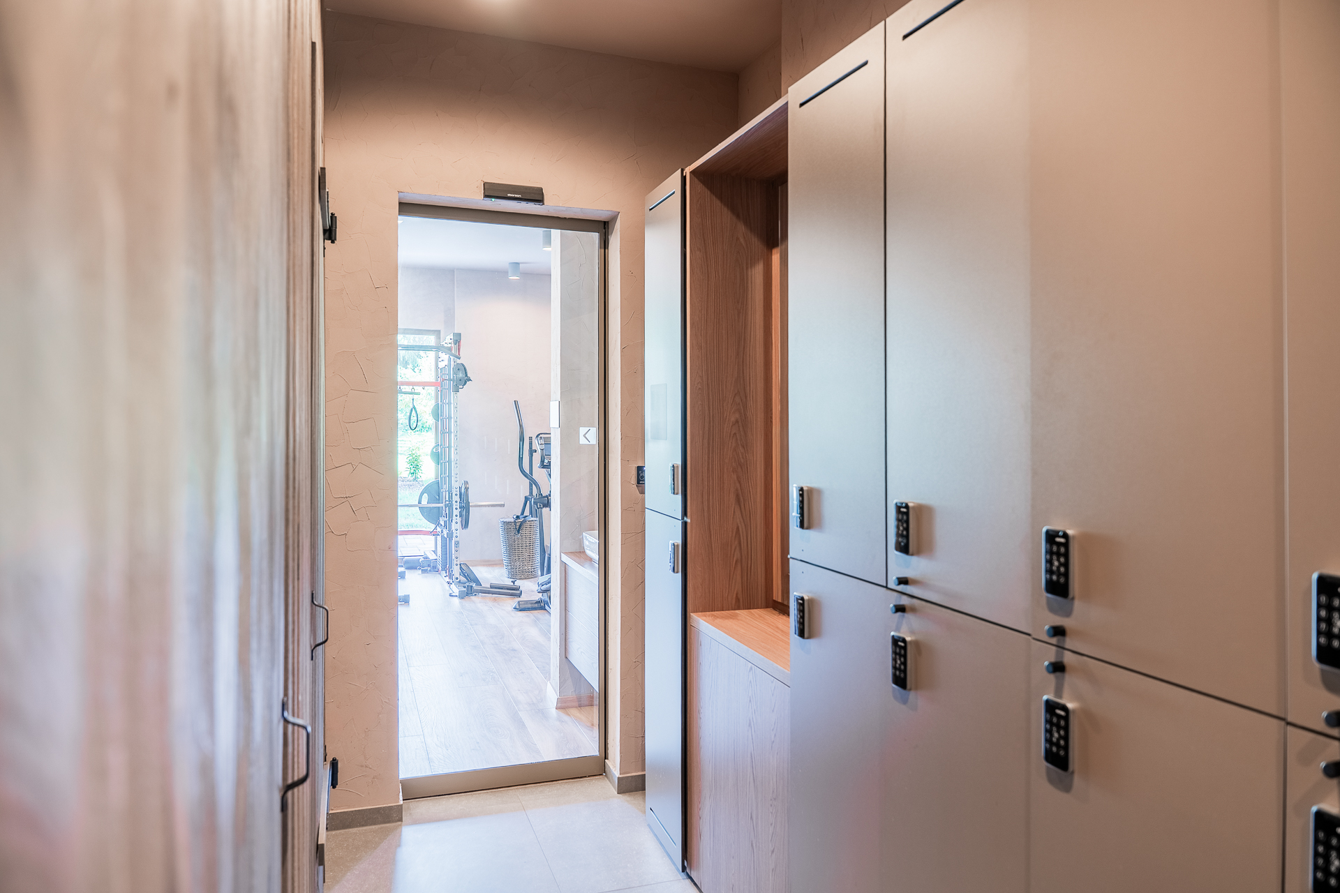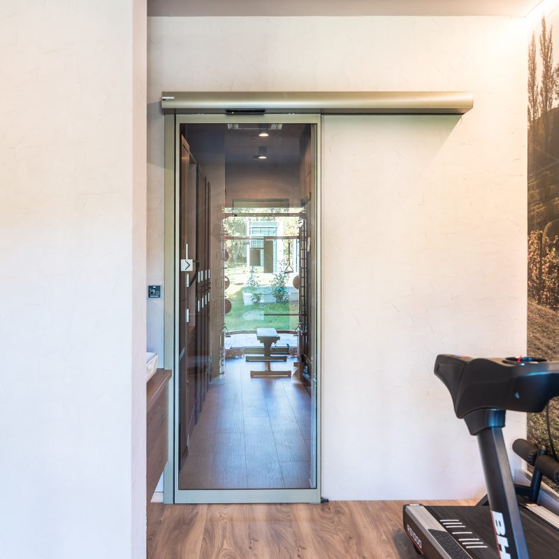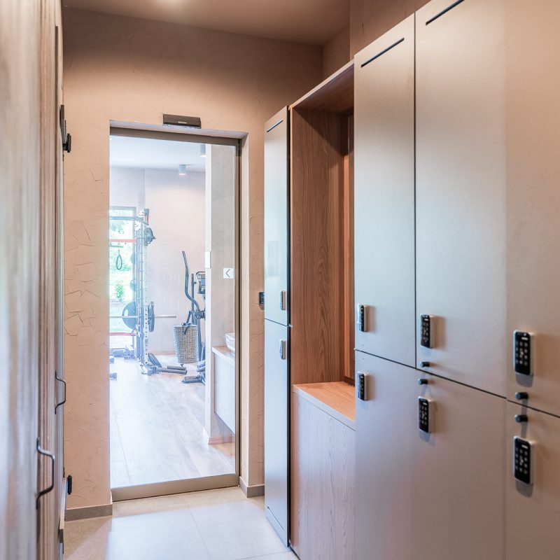 Vrata v wellnessu in fitnesu so izvedena v posebnem odtenku biserno zelene, ki ustvarja minimalistični poudarek ter se ujema z lesenimi in kovinskimi elementi, hkrati pa prispeva k umirjenemu in uravnoteženemu vzdušju prostorov za sprostitev.