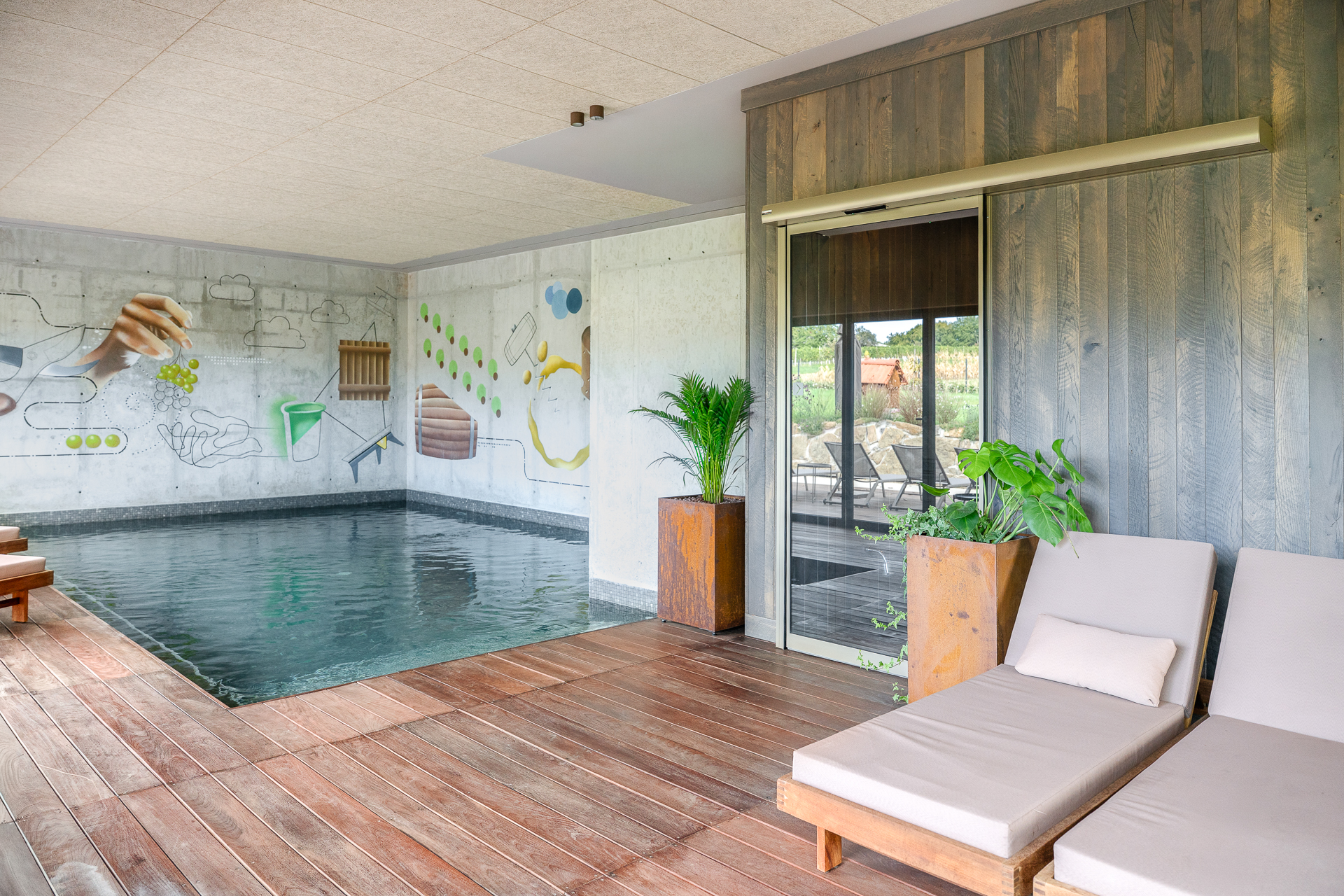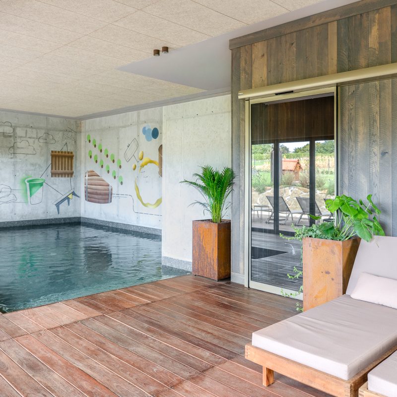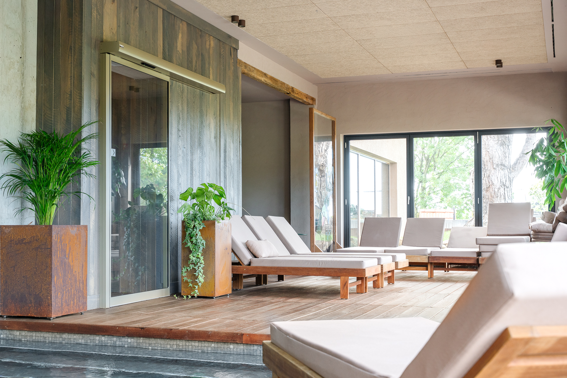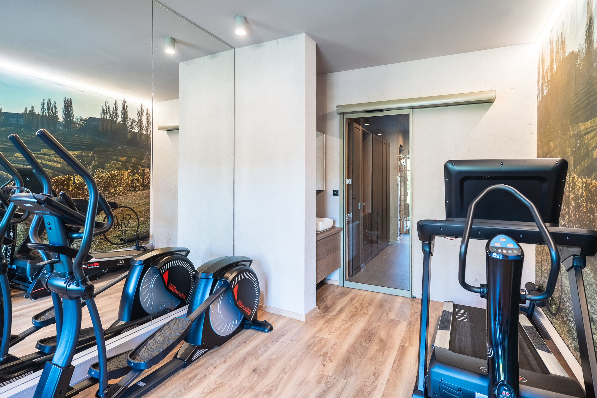 Vrata v wellnessu in fitnesu so izvedena v posebnem odtenku biserno zelene, ki ustvarja minimalistični poudarek ter se ujema z lesenimi in kovinskimi elementi, hkrati pa prispeva k umirjenemu in uravnoteženemu vzdušju prostorov za sprostitev.