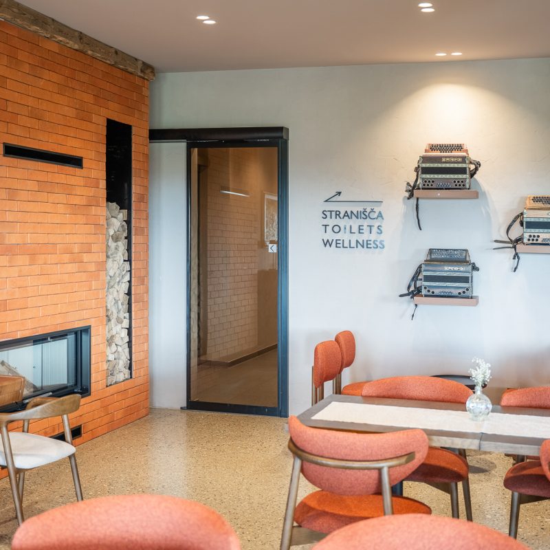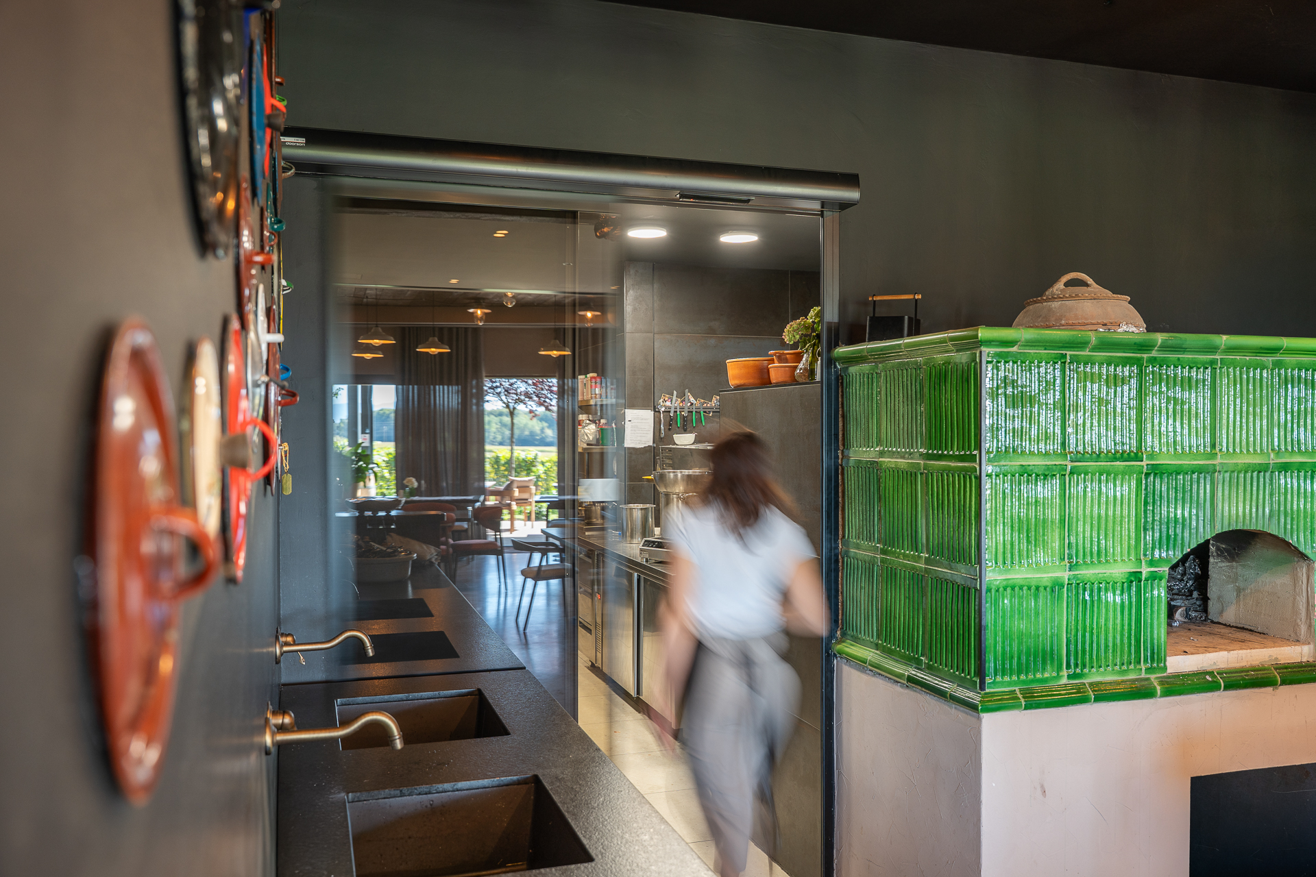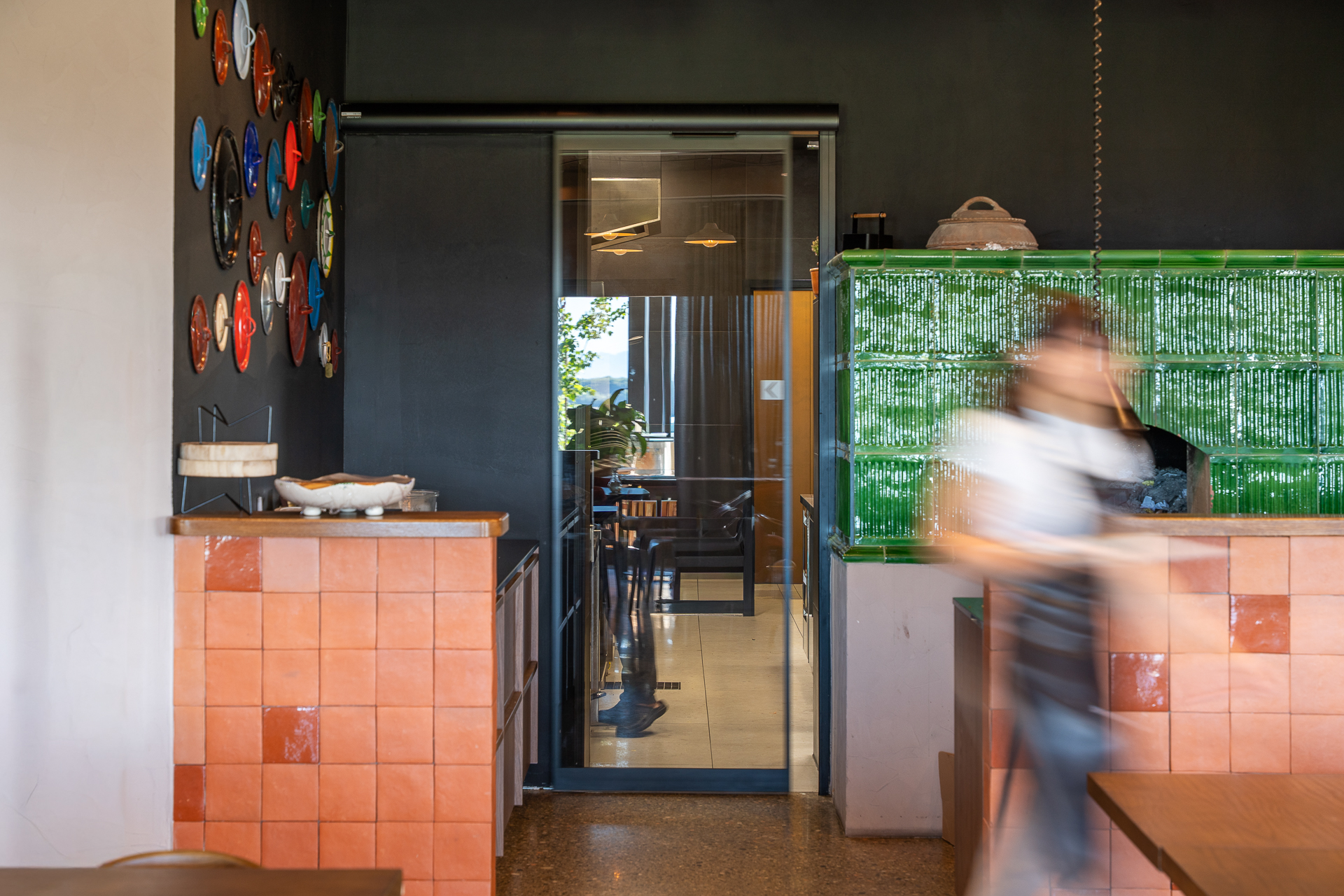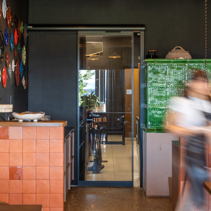 V restavraciji so vrata v temnejšem sivem odtenku, zato se zlijejo z ostalimi elementi interierja. Delujejo kot naraven del prostora in so skoraj neopazna.