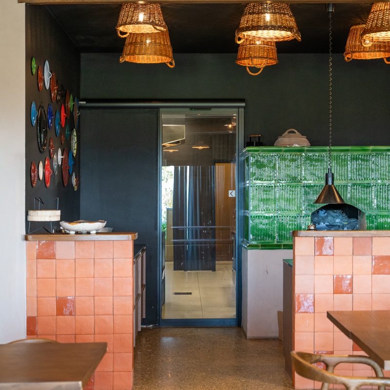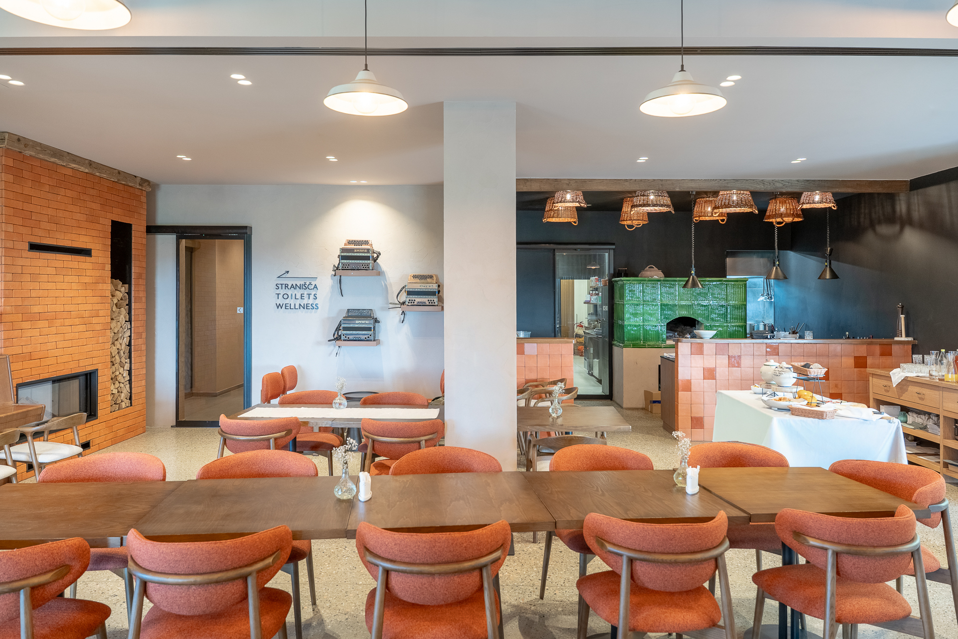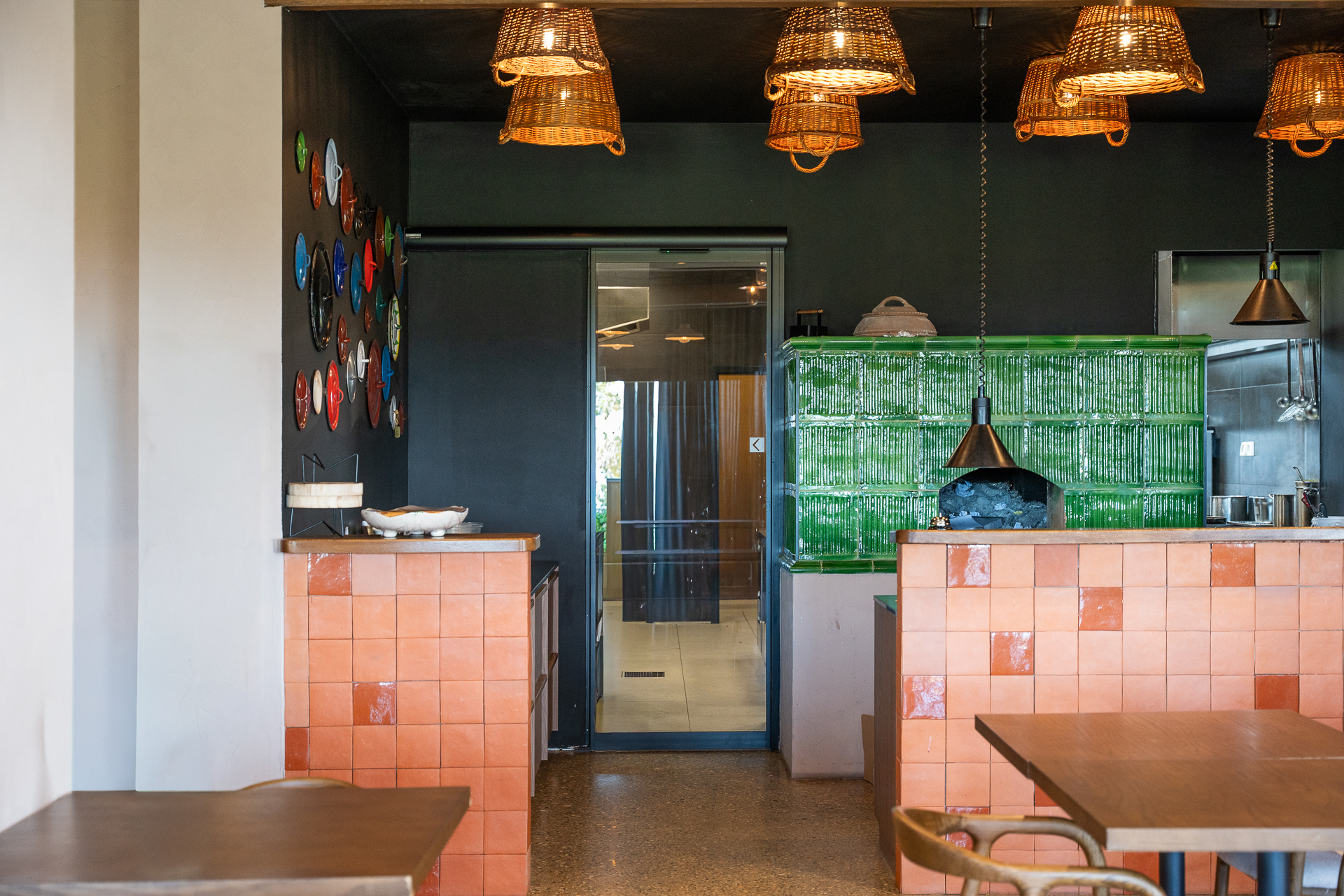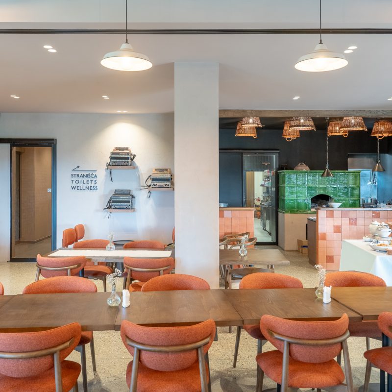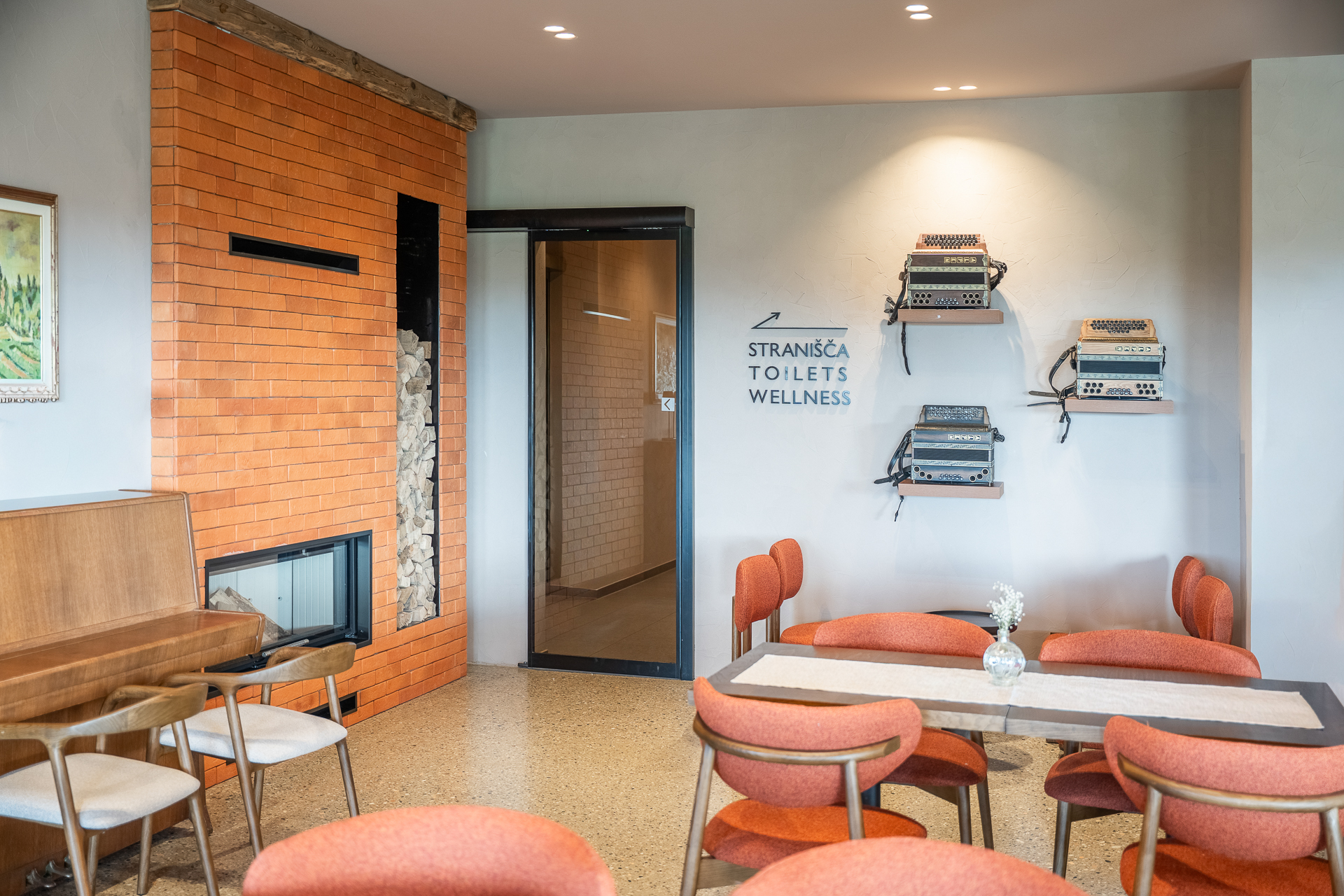V restavraciji so vrata v temnejšem sivem odtenku, zato se zlijejo z ostalimi elementi interierja. Delujejo kot naraven del prostora in so skoraj neopazna.